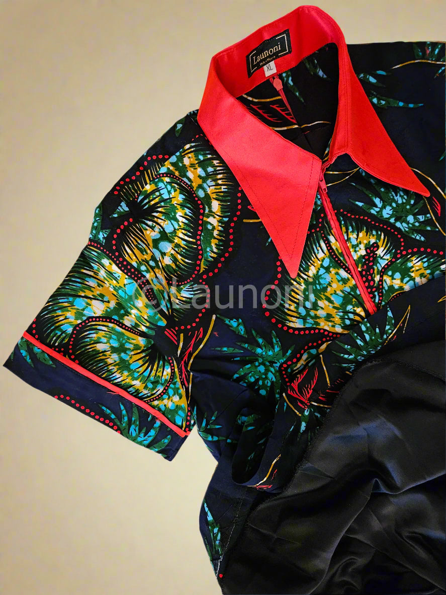 Lalube Midi Dress fabric has a deep blue background with yellow, red and green floral prints.